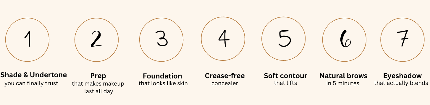 In natural light, dot less concealer only in the darkest areas. Tap to blend with your fingertip or sponge. Keep it thin. Press a tiny amount of translucent powder. Tap out any lines. Press again. See the full method inside the course.